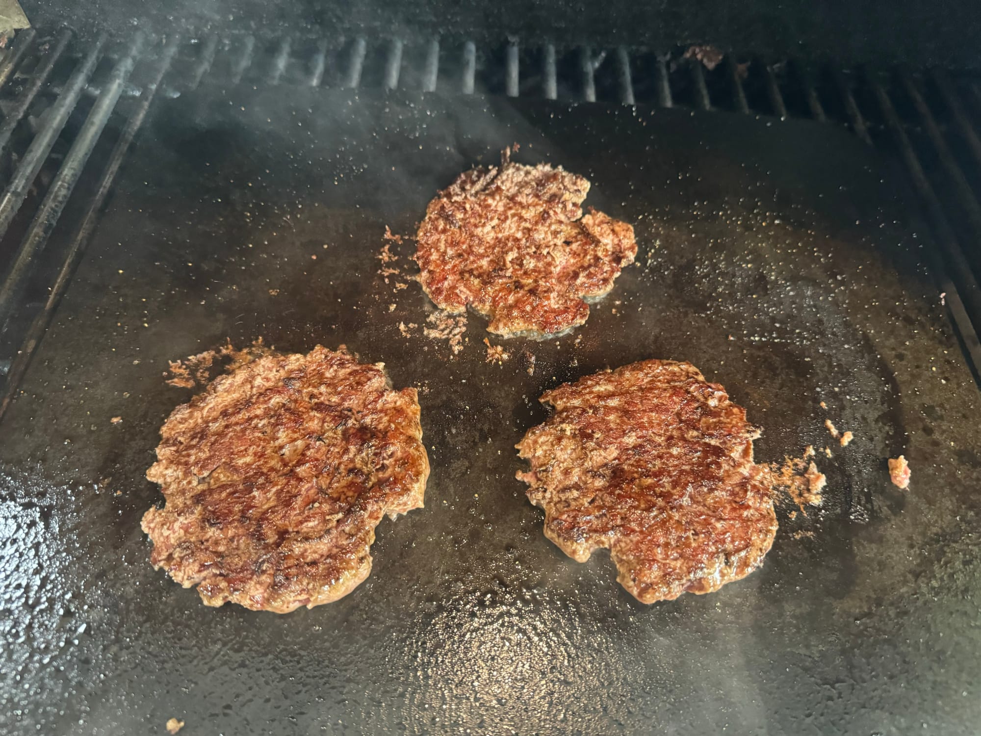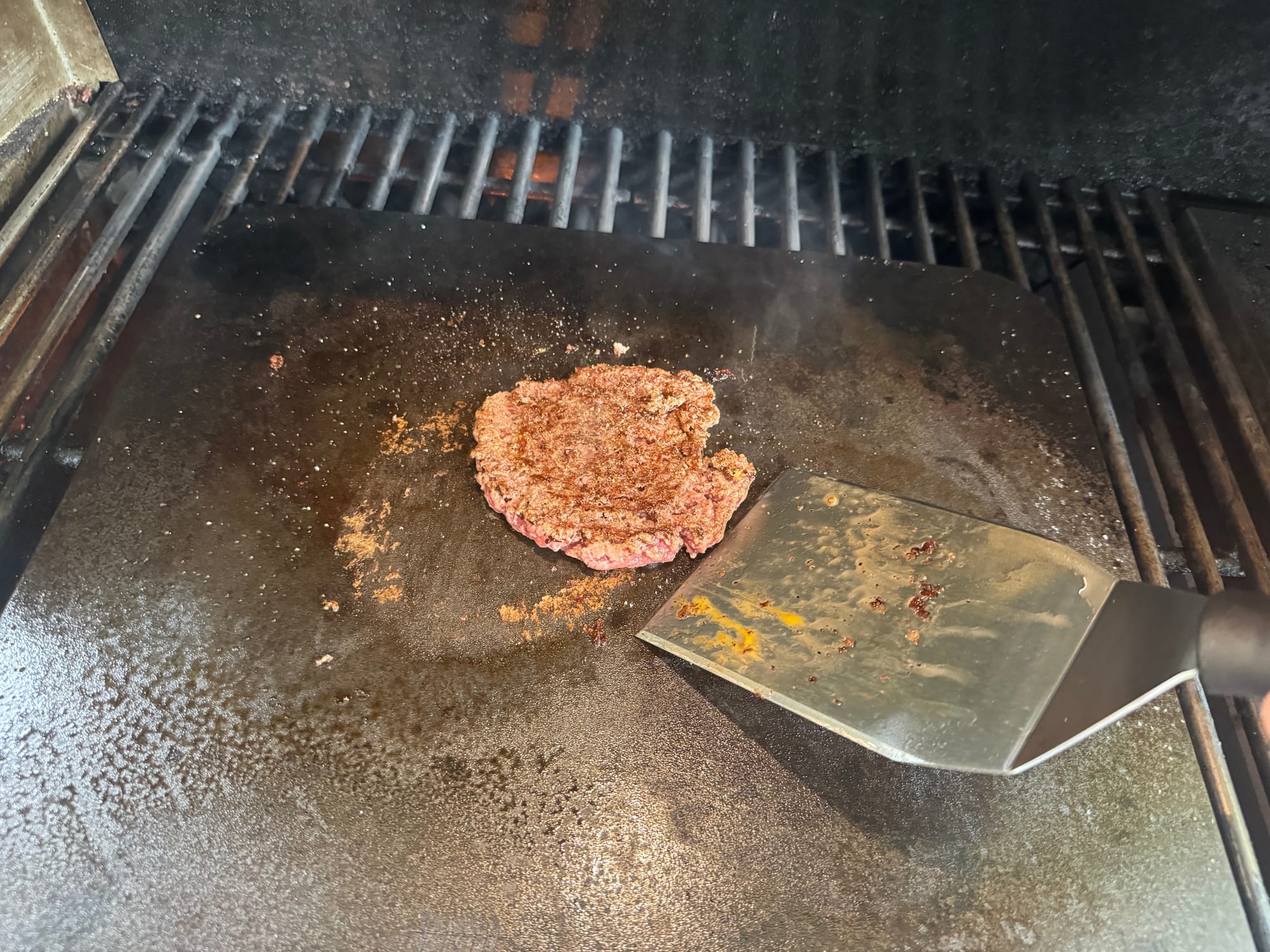 When you smash the burgers they get stuck to the surface, so you have to scrape them off before you flip them.