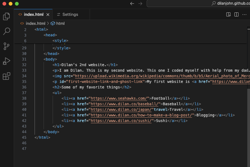 A couple of weeks ago my Dad started teaching me how to do real code like the picture above. I thought it would be super hard, but actually, once you learn the basics it gets super easy. This code looks hard but you can make a website with only a little bit of code. I use GitHub to code my website.